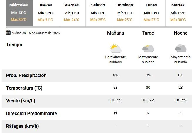 El miércoles continúa con el patrón de temperaturas por encima del promedio para esta época, marcando otra jornada con clima propio de primavera avanzada.