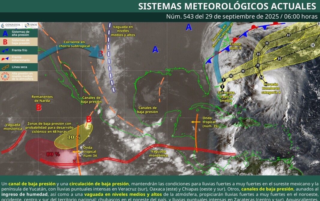 Este aviso climático se extiende por la influencia conjunta de varios canales de baja presión en el país y la humedad proveniente del Océano Pacífico y Golfo de México, lo que mantiene condiciones inestables para la mayor parte de la Península de Yucatán y sureste mexicano.