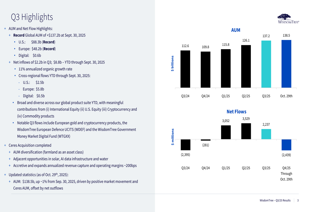 WisdomTree ha cerrado el tercer trimestre de 2025 con resultados que superan las expectativas del mercado, impulsados por un récord histórico en activos bajo gestión (AUM) y una expansión significativa de sus márgenes.