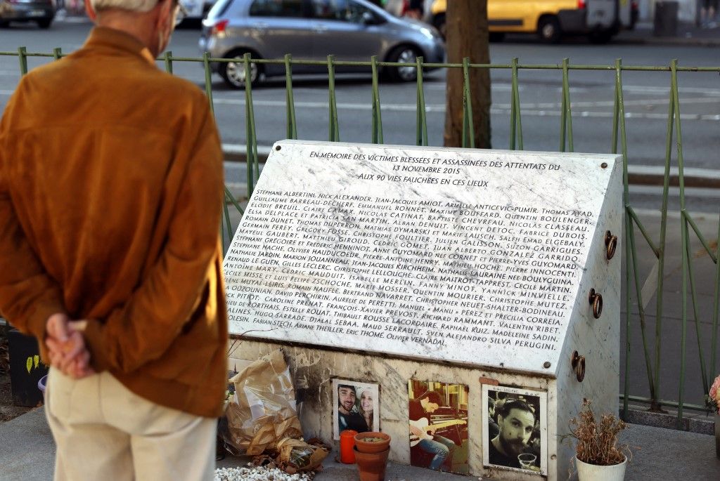 A man looks at the memorial plaque near the Bataclan theatre and Cafe in Paris on September 3, 2021 where jihadists attacked and killed 90 people on November 13, 2015. France's biggest trial in its modern legal history begins on September 8 over the November 2015 attacks on Paris that saw 130 people slaughtered at bars, restaurants and the Bataclan concert hall. The suicide bombing and gun assault by three teams of jihadists, later claimed by the Islamic State group, was France's worst post-war atrocity. (Photo by Thomas COEX / AFP)