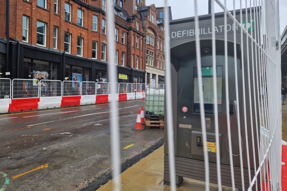 Un desfibrilador ubicado en plena Pinstone Street, corazón de Sheffield, ha quedado inaccesible y fuera de servicio debido a las obras viales que están en curso en la zona.