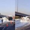 Tráiler cargado con pintura blanca volcó en Ecatepec y genera tráfico lento hacia el Periférico.
