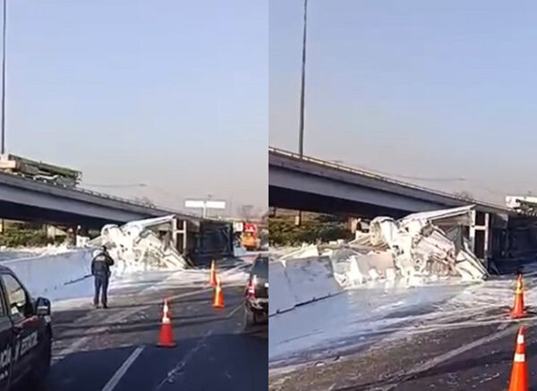 Tráiler cargado con pintura blanca volcó en Ecatepec y genera tráfico lento hacia el Periférico.